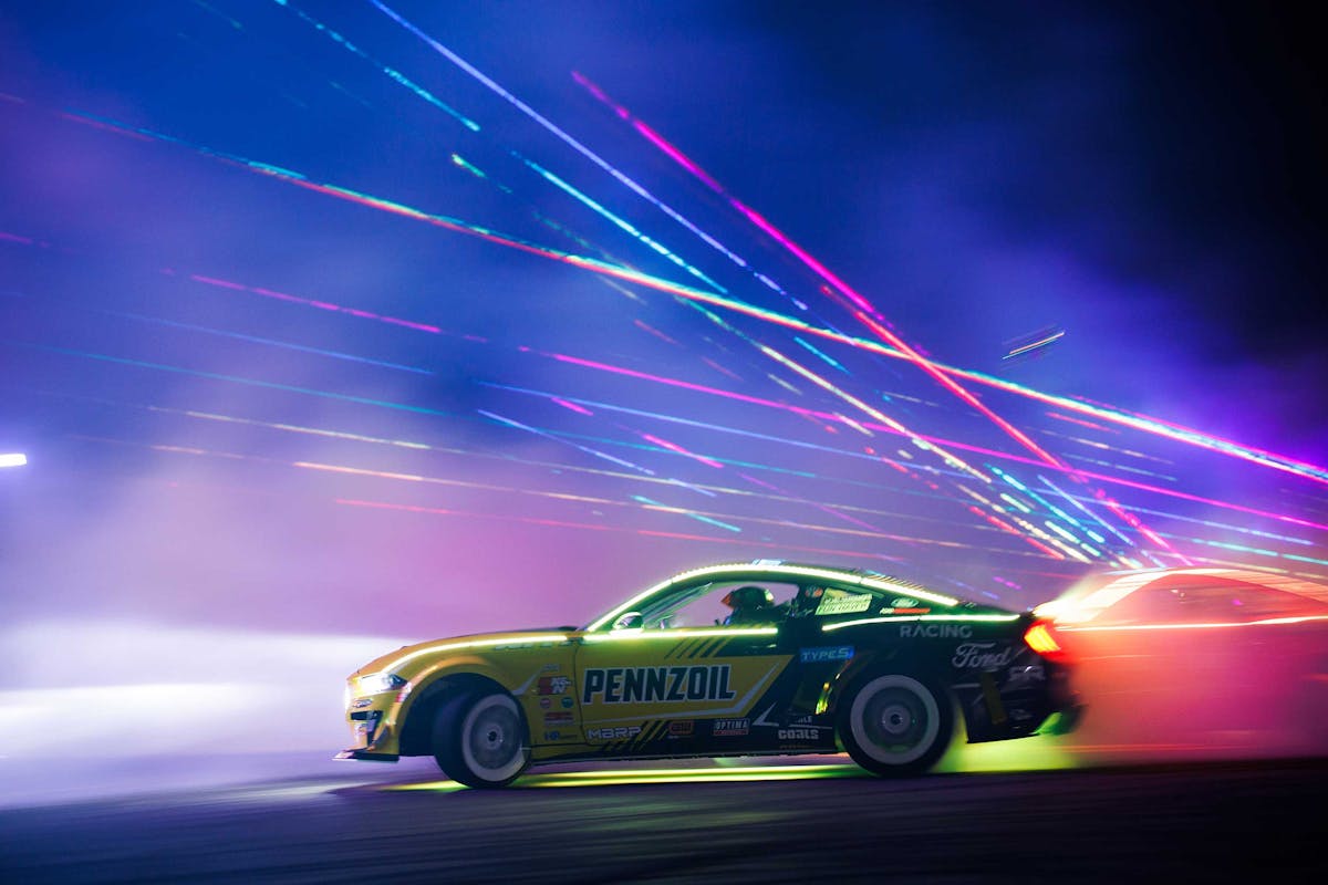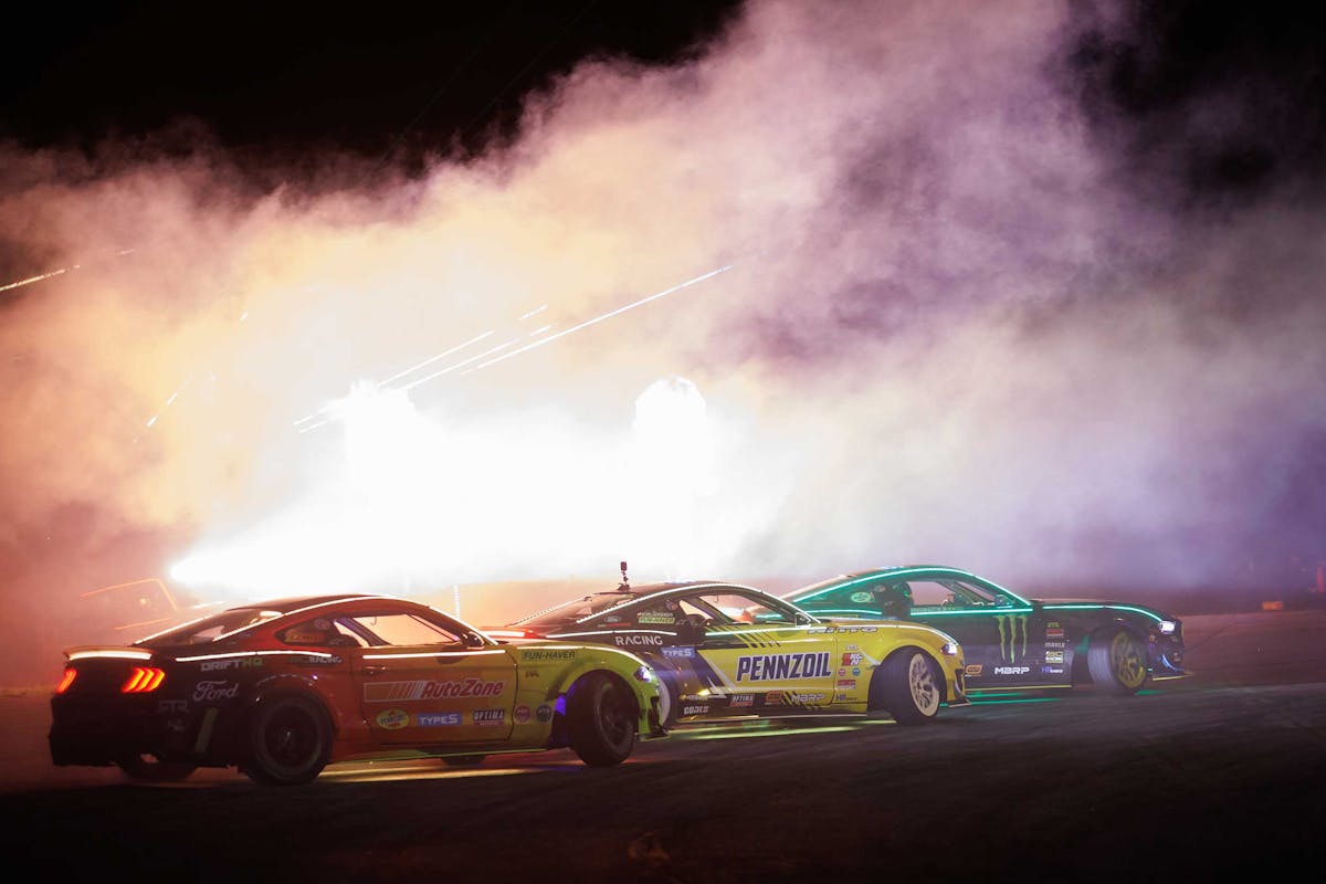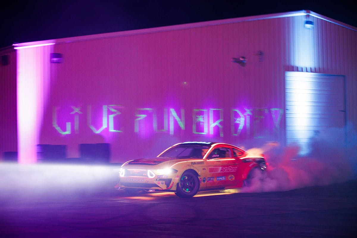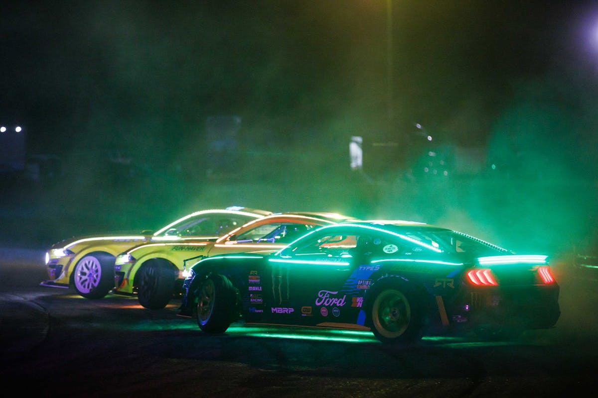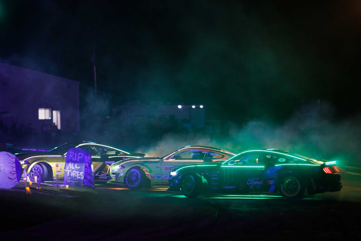 Not only do the RTR Mustangs, adorned in glowing TYPE S LED lighting, shred tires in triple tandem form surrounded by lasers and pyro, but Healy leaps over the pool and through a fence in his Bronco. All that action is set to the tune of a new T-Pain track titled Spooky Shreds (Fox Body), which name-checks both Gittin and Denofa in its lyrics.
