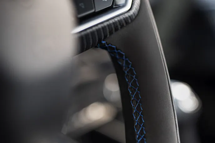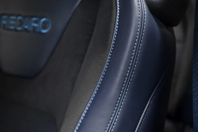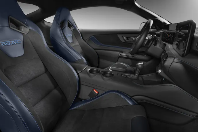 The most striking of the appearance options is the Blue Ember metallic paint seen on display at the Stampede and in many of the first images of the car. This color-shifting hue harkens back to the Mystic hue deployed on the 1996 Mustang Cobra, but Blue Ember features pigments of deep blues infused with a warm amber that allows it to shift colors depending on the type and angle of the light that hits it.