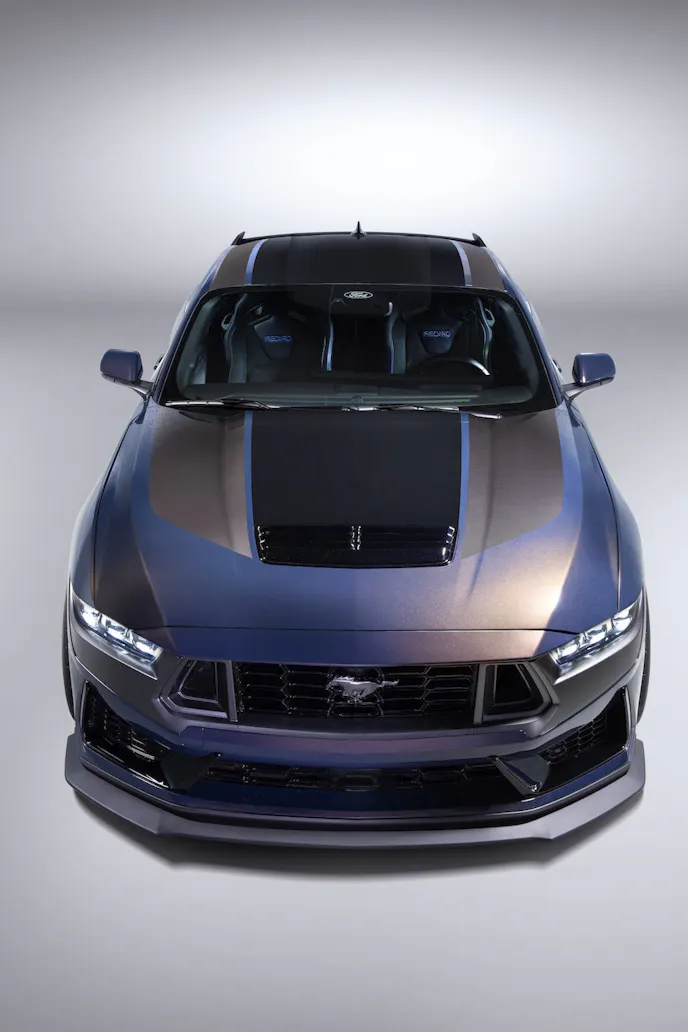 “If color is a reflection of a vehicle’s personality, Blue Ember transforms the Mustang Dark Horse and highlights a natural saddle-color horse hidden inside the strong chiseled fastback’s exterior form,” Kennerly says. “Multiple elements are combined to give Blue Ember its intriguing and stealthy appearance that really drives home how unique Mustang Dark Horse is.”