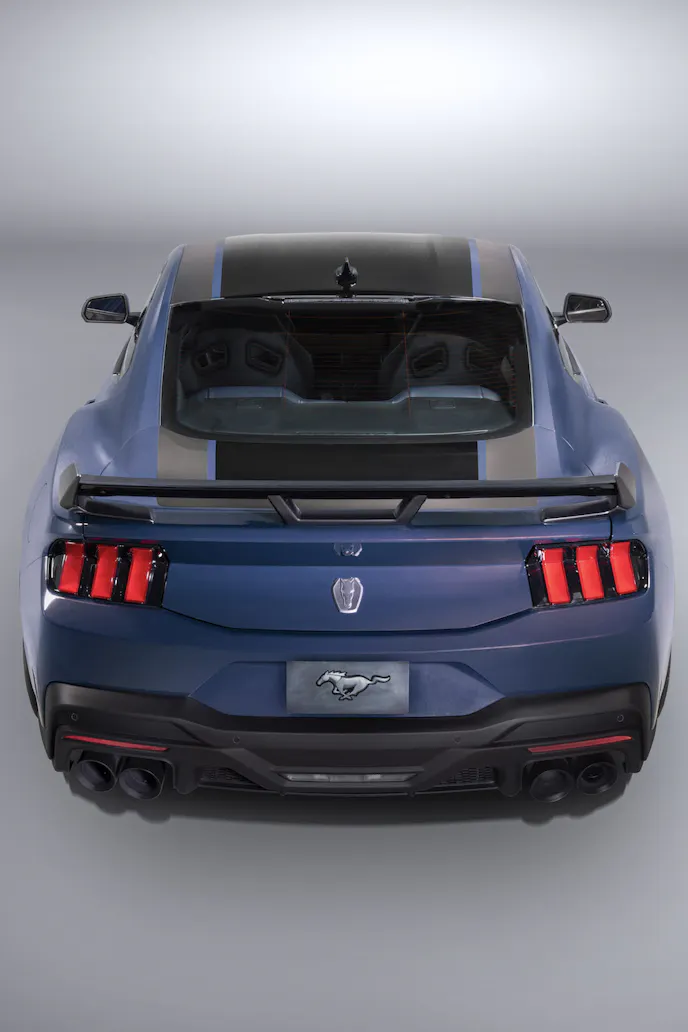 Accenting that color are two optional striping packages, one painted on and the other a vinyl appliqué. The accents continue inside for those who opt for the Mustang Dark Horse Appearance Package, which adds a range of Deep Indigo Blue accents and seat belts along with Bright Indigo Blue stitching.