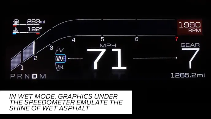 - Wet mode carries many of the same information concepts over from normal mode, using a blue theme and a “wet floor” concept. Graphics under the speedometer emulate the shine of wet asphalt to remind the driver of the mode selection.