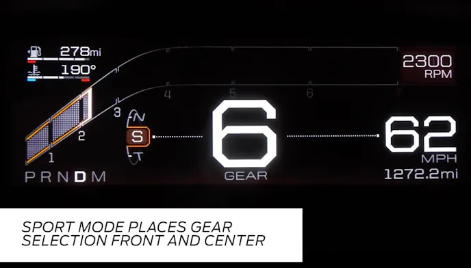 - Sport mode adjusts information priorities. Front and center is gear selection, with the speedometer off to the right and less prominent. It’s displayed in an aggressive orange theme and is the preferred mode for most test drivers.