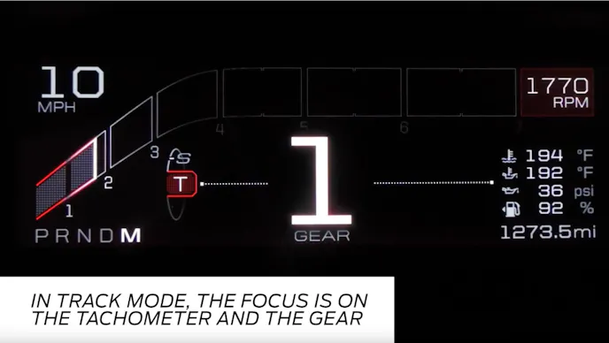 - Track mode presents a stark combination of black background and highly legible text and graphics, in a crisp, red theme that’s easy for the eye to pick up in a fast-paced environment. Gear selection and engine speed are displayed prominently, while coolant temperature, oil pressure, oil temperature and fuel level—rendered as a percentage rather than miles to empty—are bottom right.