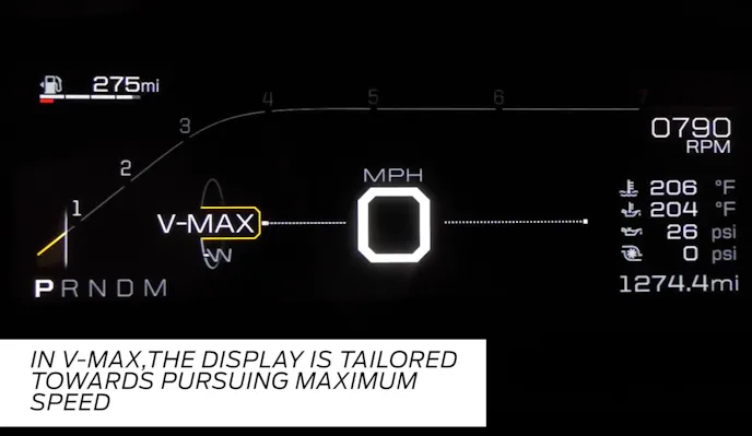 - V-Max offers an entirely different display—purposeful and pared down. Specifically tailored to pursuing maximum top speed, it displays a large, centered speedometer, with tachometer reduced to just a line with indicator dot for minimal distraction. Coolant temperature, oil pressure, oil temperature and turbocharger boost are displayed to the right, with fuel level displayed top left.