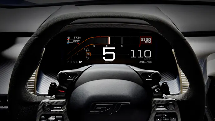 That’s definitely exciting to hear, but the Ford GT already shares a technology offered in cars that are available to the masses—drive modes. What makes this setup unique is that the digital instrument cluster changes based on the drive mode selected via controls on the steering wheel.