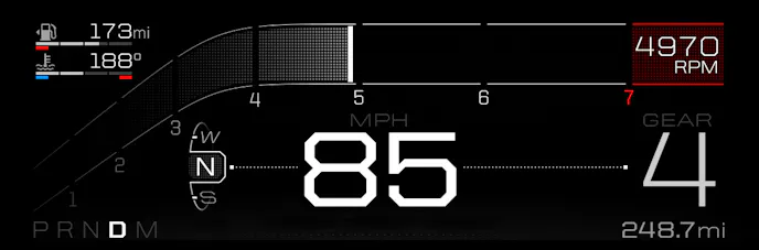 - Normal mode displays information in a purposeful, businesslike manner. The theme is simple; the speedometer is centered and bold, gear selection is to the right, fuel and temperature are top left. The hockey-stick-shaped tachometer displays in a compressed scale for lower rpm, as the engine revs so quickly the lower counts mean almost nothing to the driver. The 3,000-to-7,000-rpm range dominates the top of the display.