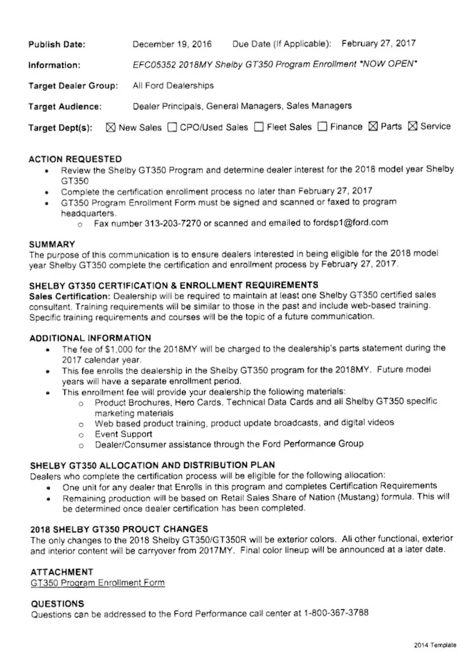 This leaked dealer document hit the forum scene today and indicates that dealers have until February 27, 2017 to fill out the paperwork that will earn them the ability to sell the top-shelf Mustang for 2018.Though it has yet to be officially confirmed as continuing beyond the 2017 model year, it appears that the Shelby GT350 will return for 2018. According to documents sent to Ford dealers today, those interested in selling the 2018 Shelby can enroll in the certification program for the car.