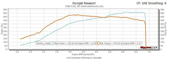 The TunePlus-built engine put down an impressive 515 horsepower and 480 lb-ft of torque to the wheels with 24 pounds of boost — all while still burning 93-octane pump gas.