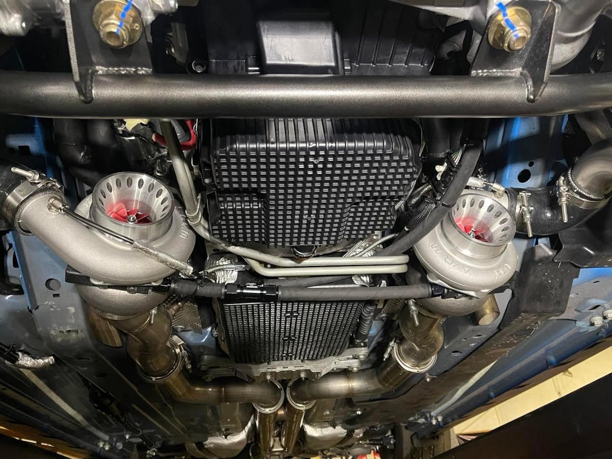 To achieve that lofty target he bolstered the factory Gen-3 Coyote engine with PAC valve springs, upgraded secondary timing chains, and billet oil pump and timing gears. Those mods readied the engine for plenty of boost from a Hellion Sleeper twin-turbo kit wearing upgraded, billet 64mm snails.