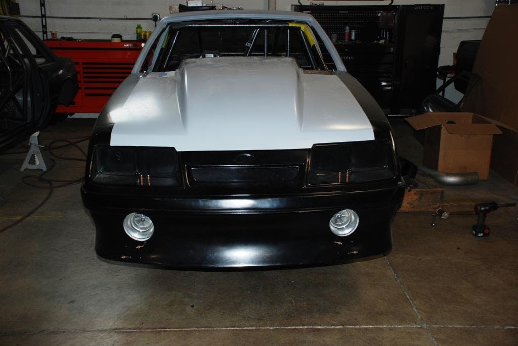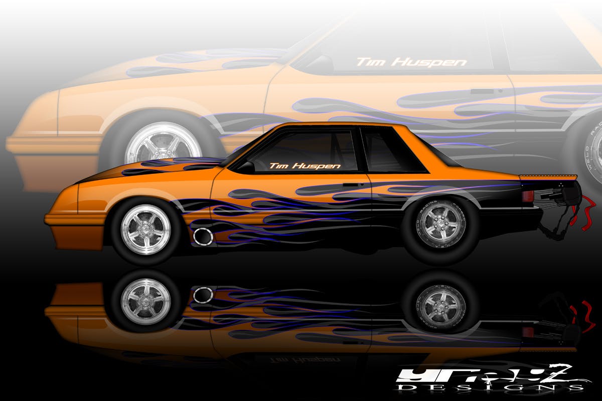 A brand-new wrap design (as you can see above) was designed up by GregZ Designs, and the rest of the car will be repainted by Tim’s crewmember Rick in the familiar Tangelo Orange hue Huspen’s been running for years. In conjunction with Team Z, Motor City Solutions popped a brand-new ’86 Mustang front end out of the mold for Huspen – he’s the first guy anywhere to have one. He’s also got a set of MCS doors, hood, and decklid.