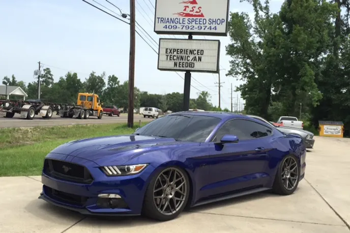 Polaski is obviously no stranger to Mustangs, and this is his 2015 GT. He bought the car new, and the GT didn’t remain stock for long. He added an Airlift Performance airbag suspension, and HRE FF01 wheels in a custom bronze finish, with Nitto Extreme Drag radials out back to give the car some attitude. However, the car needed the power to match the car’s improved exterior disposition.
