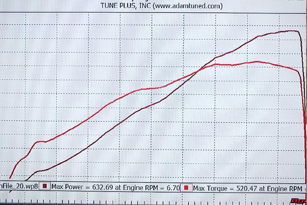 Tuning: Cobb Accessport“Final numbers were 632 wheel horsepower and 520 wheel torque. We finished tuning around midnight tonight and were fighting the stock low side fuel pump, too soft of springs in the wastegates, and having just enough injector on the port side,” said Adam on social media. “You can see the dips on the graph from the gate oscillating trying to control boost. Drop in some higher pressure springs, and it would smooth right out.”