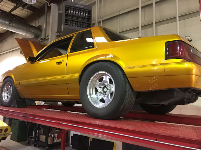 The Fox is powered by a 302 small-block Ford with Trick Flow Twisted Wedge heads and a super mild Trick Flow camshaft. It also has a BBK intake manifold, Pony Down Performance single turbo kit, and was dyno tuned by Mike Post out of Illinois.