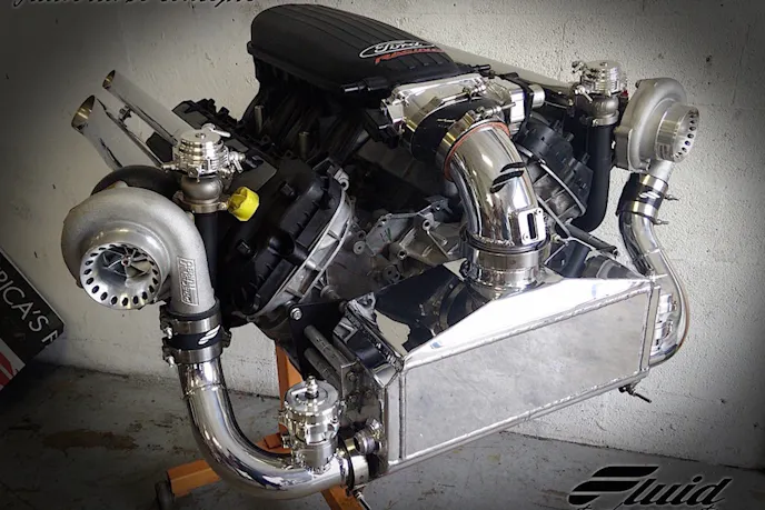 As their project progressed, the original idea was replaced by the turbochargers in the picture above, which are twin second-generation Precision 64/66mm ball bearing turbochargers. The kit was built by Fluid Turbo Concepts out of Boynton, Flordia. They’re well known for building custom turbo kits for 5.0 liter equipped Mustangs, which is where the kit you see above originally stemmed from.