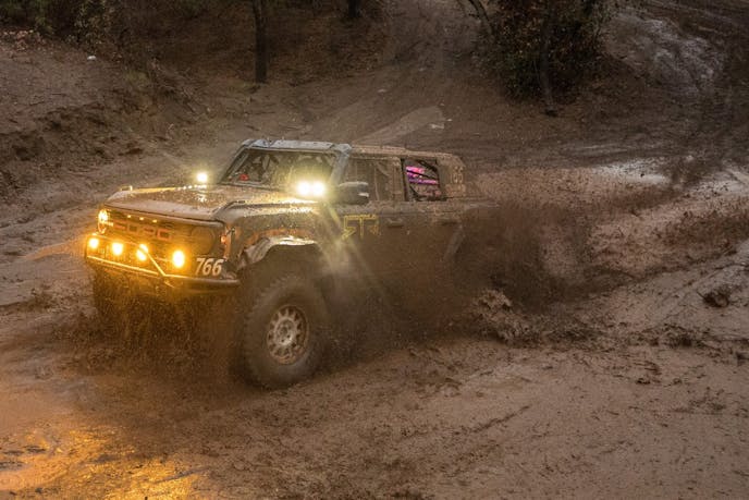 The Bronco Raptor — piloted by Loren Healy and Eric Davis, Vaughn Gittin Jr. and Jeremy Dickinson, and Bailey Campbell and Bryan Crofts — fought through the night and a Saturday storm to secure the Stock Mid-Size win, proving the durability of its desert-bred platform with a decisive Baja 1000 performance. (Photo Credit: Ford Racing)