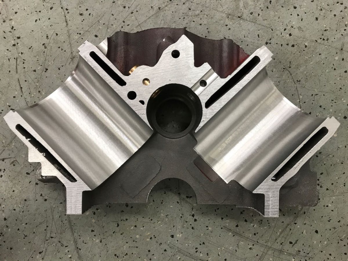 The aluminum blocks are cast from a proprietary Alcoa material “used in aerospace,” according to Tim. “Ours is the first block to use it.” Also secret are the sleeve materials — he’s offering two. The first is, “stronger than normal,” and the upgrade is, so “phenomenally strong, we call it Super Sleeve.”