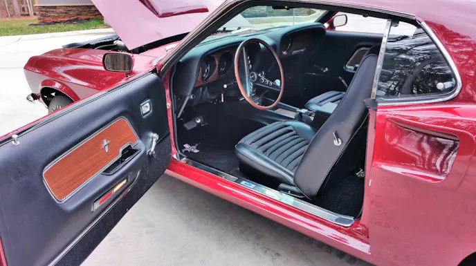 According to the original Mecum Auctions (where the car will cross the block next month) listing it is one of only 279 equipped with the rare 820-S NASCAR solid-lifter engine and smooth chin spoiler. The dark-red Boss 429 features a numbers-matching 429ci V8 filled with the familiar forged pistons and steel crankshaft. As if boasting low-production-numbers wasn’t enough, you can add one of 132 produced with these paint and trim options to its rarity roster.