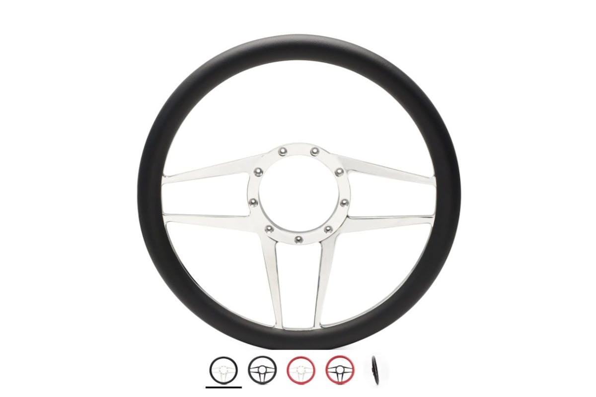 Available in raw machined, polished, or Fusion coat colors — including Bright Clear Protective Fusioncoat Finish, Matte Black Fusioncoat Finish,  Gloss Black Anodize Finish, Gloss Black Fusioncoat Finish, Clear Anodize (Matte Silver) Finish, Bright Blue Fusioncoat Finish, Bright Red Fusioncoat Finish, Bright Purple Fusioncoat Finish, Gloss White Fusioncoat Finish, and Bronze Fusioncoat Finish — these wheels accommodate a range of vehicles, Eddie Motorsports offers installation and horn adapters compatible with GM, Ford, and Mopar vehicles. The Half Wrap Limit Steering Wheel 13-1/2 carries a price tag of $215.