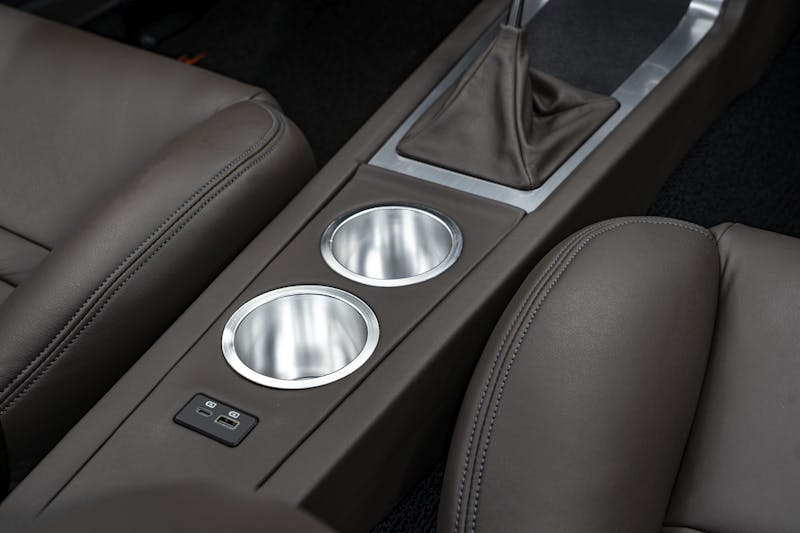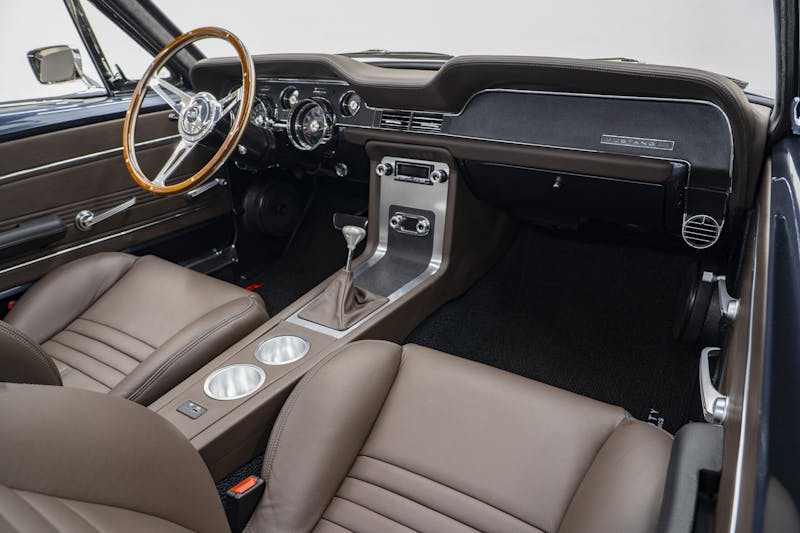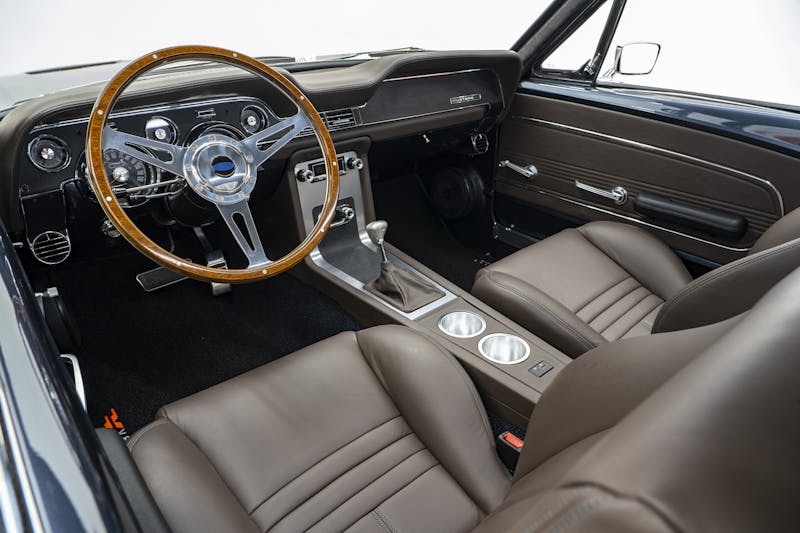Electric vehicle conversions may be the latest craze, but rest assured under the hood of this beautiful Fastback Mustang is a V8 5.0-liter Coyote engine from Ford Performance. The modern power plant produces an impressive 460 horsepower and 420 lb-ft of torque. Power is transmitted to the rearend through a 10R80 10-speed transmission, coupled with a Ford 9-inch rear end equipped with 3.73 gears. While the heart of the Mustang resides in the front, its backbone consists of a Roadster Shop Mustang SPEC chassis, providing excellent handling. Keeping the car firmly planted to the pavement is an independent front suspension paired with a four-link rear suspension and adjustable Fox coilovers on all corners. Baer Brakes four-piston calipers paired with 11-inch rotors bring the pony to a halt.
