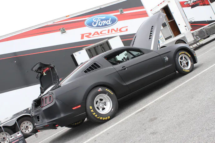 The car is powered by the now-familiar 5.0L Ti-VCT engine topped off with a 2.9L Whipple/Ford Racing supercharger. New for 2014 is the C3 automatic transmission featuring a Reid aluminum case and new gear set, built by Joel’s on Joy in Detroit. Unique to the new CJ is the sweet matte black paint finish available only on these cars – not the mainstream Mustang. At this time, the Ford Racing team is not prepared to share any testing numbers, but if past accomplishments are any indication of future performance, mid-eight-second elapsed times or quicker are on the horizon for the new machine. Evan Smith and Ford Racing chassis engineer Andy Vrenko were on-site in the driver’s seat, and after a complete week of testing, the Ford Racing team now has tons of data to digest before the cars are sold to the general public. Production is scheduled for sometime this summer, and hopefully at that time we’ll be able to show you some of the behind-the-scenes action that happens in the Flat Rock assembly facility. For now, enjoy the sights and sounds of wheels-up Cobra Jet prototype goodness on the dragstrip.