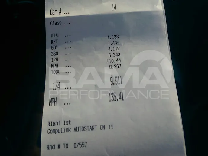The official number is a 9.91 at 135.41. Interestingly the car pulled what we’d consider a pretty slow 60-ft time of just 1.445. If the BAMA guys can get more aggressive on the launch, this car could have a lot more in the combination. That is, if the IRS can handle the hit, at this point, the IRS is likely leaving a lot on the table.