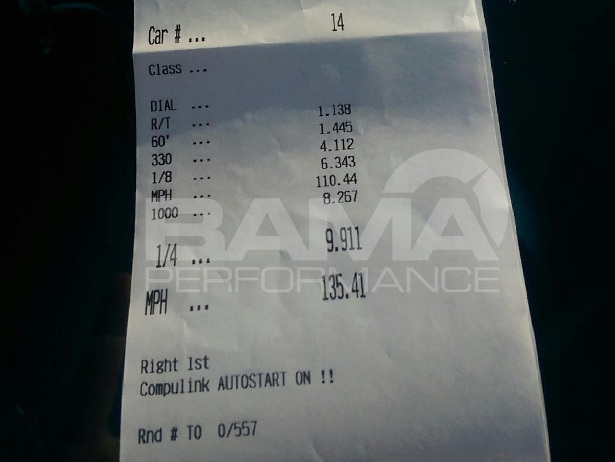 After upgrading the car to handle the power they were putting to the rear tires, the BAMA guys were able to knock down a healthy 10.41 in the quarter-mile. That number destroyed the record set by Ford Racing, a 10.97 with their supercharged setup.
