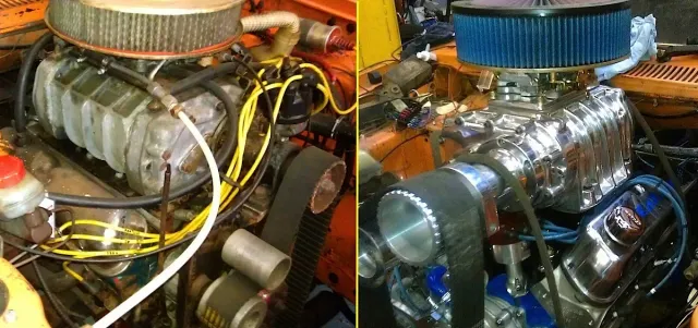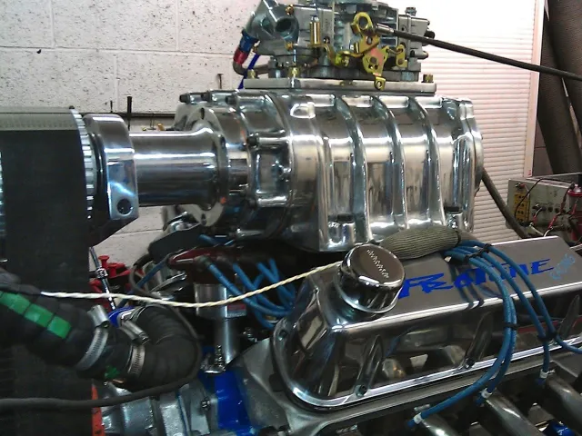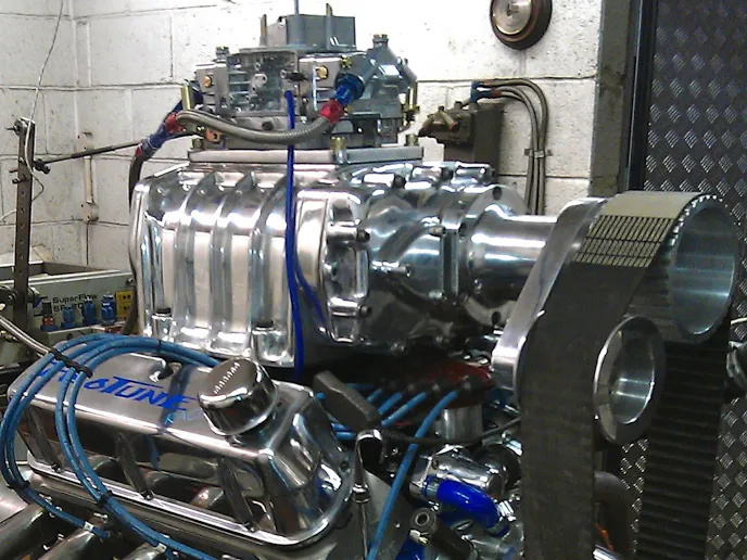 The team first considered purchasing a turnkey engine from the US, but then decided to take on the project. A new short block was assembled using a Dart block, Eagle steel crank and rods, JE pistons, Canton oil pan, Melling oil pump, ARP fasteners, Fel-Pro gaskets, Mahle bearings, Cloyes timing chain and Comp Cams cam and valvetrain. Edelbrock Victor Jr. heads were fully ported and mated to an Offenhauser intake manifold modified to support the Jimmie blower, which was refurbished with the help UK Blowers. Turning the vintage supercharger required custom-made billet pulleys and a new tensioner. Rounding out the build are a Mallory distributor, MSD box, Moroso wires, Holley 700 cfm carb and custom headers. Machine work