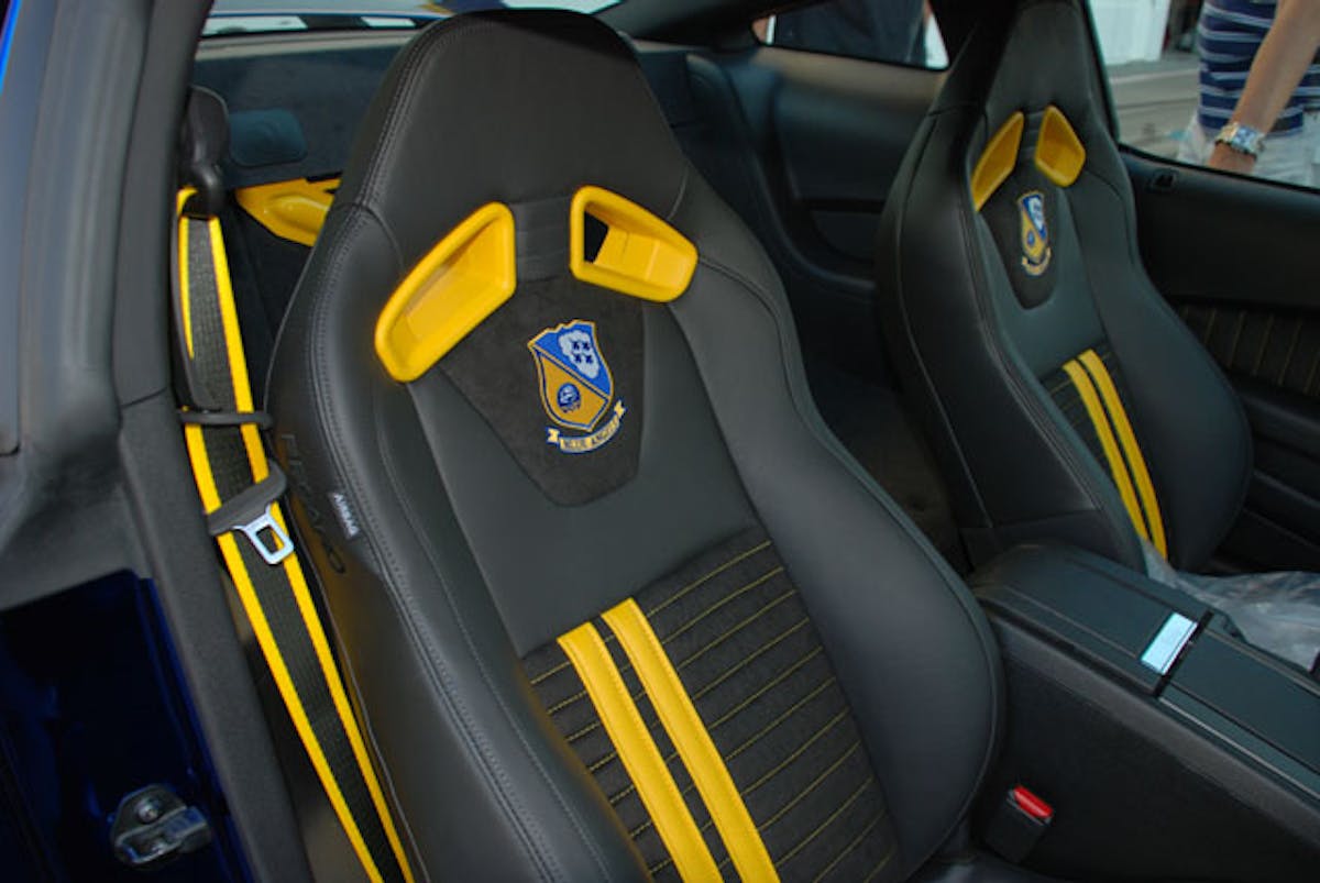 Blue Angels crests are embroidered into the leather Recaro racing seats and the interior also features offset stripes, inspired by the pilot’s flight suits.