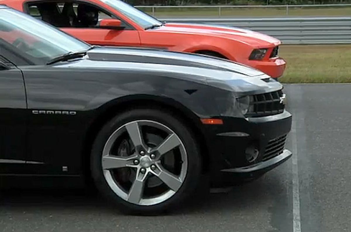 The lap time for the 2012 Boss 302 Mustang was 1:20.392, while the Camaro SS posted a 1:22.440 result. You’ll see in the video that the Camaro was fast off the line, but couldn’t sustain its advantage at speed. Here are some comments from the American Muscle folks.