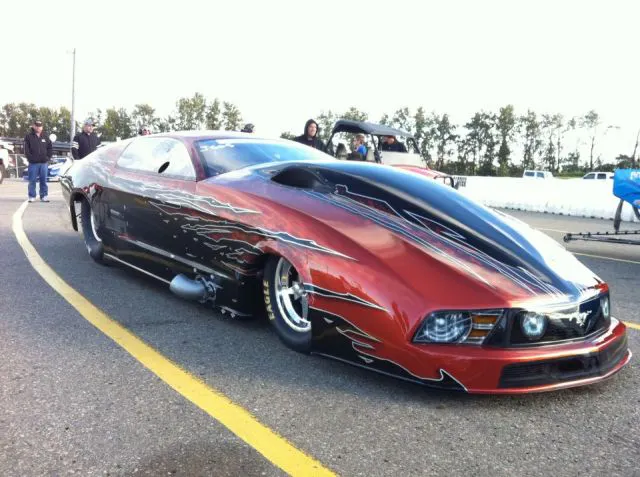 Just a couple of weeks ago, Dragzine brought you a story on this Canadian Pro Modified Mustang owned by Jim Bell and piloted by Jim Obalek. The Mustang, consisting of one of Mike Moran’s wind-tunnel-tested Pro Mod bodies, sits atop a Jerry Bickel-built chassis and is powered by one of Pro Line Racing’s twin-turbo engines. The team has been working on the new-car bugs, and this past weekend in Mission, British Columbia, Canada, the car was prepped and ready to go. According to speedzonemagazine.com, “at around 5.3 seconds (into a 6.12/224 mph run), The car went lean (fuel pump related) and it torched a head. From there, fuel and then oil ignited and Jim Obalek was along for a wild fiery ride. The car’s body suffered substantial fire damage, the engine will need work, but Obalek did a great job of keeping the car off the wall (he was blind for a good portion in the shutdown