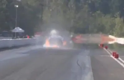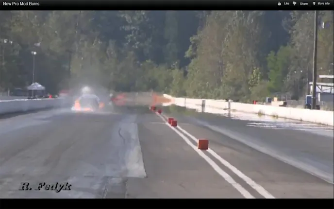 Pro Mod racing is a dangerous undertaking. With the unreal elapsed times and speeds the cars are capable of and thire on-the-edge nature taken into account, there’s always the chance of parts failures, fires, and the like. Thankfully today’s safety systems that are required are designed to minimize the chance of damage should something untoward occur. Nice to see the fire safety crew on the scene quickly, and we’re happy to hear that Jim Obalek will be fine and the car will be able to be rebuilt.