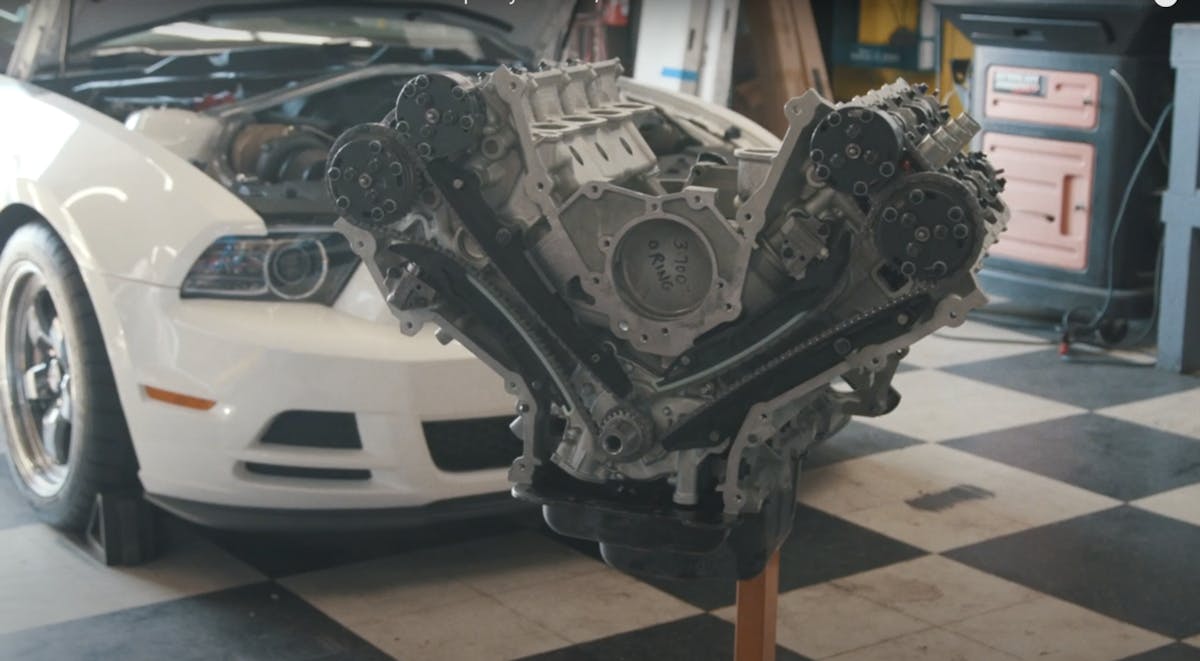 After removing the Boss from the rollers, the CCC team spent some time getting the modifications installed. The camshaft swap was accompanied by the replacement of the stock cylinder heads with those of the GT350 variety. The block itself is a Gen 1 Coyote with Darton sleeves installed. Rentis explained that the stock plasma-transfer wire arc liners limit the amount of power they would be able to make, but the sleeves will reinforce the cylinder walls to allow for higher power ratings.