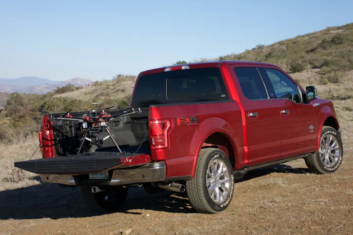 Developers are tasked with using the bed of the F-150 as a launchpad for the mobile drone platform, with ground and airborne vehicles in constant communication. One can imagine a scenario where a drone launches and then follows a pre-determined flight path to map the area, with information streamed to the SYNC 3 infotainment system. After the drone has launched, the driver can continue on to the next area, and the drone will automatically catch up.