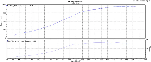 Urist, sent us a text message earlier today letting us know that there was a new video, showing what happens when he tapped the button on the Turbosmart EBoost2 controller and took things from 12-14 psi up just a notch to 16.5 psi. That small bump in boost doesn’t sound like much, but on this car it made a major difference. Add in an updated tune from Blow By Racing, and the car was making a staggering 949 hp and 806 ft-lbs of torque.