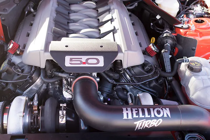 We brought you the scoop on the awesome Hellion 2015 Mustang GT, equipped with a twin turbo system earlier this week. The Competition Orange fastback debuted at the 2014 SEMA show, wearing a pair of Precision turbos, and was making 750 hp to the rear tires at the time of the show. It should be noted that this car has the upgraded Precision 64/66 turbos, standard kits will utilize Precision 62 kits with the 64/66 available as an upgrade. This was all done with the stock 2015 GT internals.
