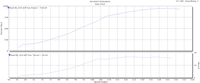 Urist, sent us a text message earlier today letting us know that there was a new video, showing what happens when he tapped the button on the Turbosmart EBoost2 controller and took things from 12-14 psi up just a notch to 16.5 psi. That small bump in boost doesn’t sound like much, but on this car it made a major difference. Add in an updated tune from Blow By Racing, and the car was making a staggering 949 hp and 806 ft-lbs of torque.