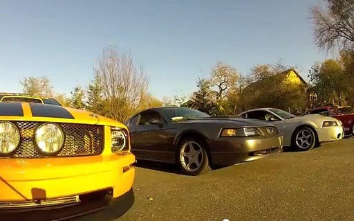 The four Mustangs in question look to be a ‘65 or ‘66 Shelby GT350, two SN95’s (including one Cobra) and a very yellow S197 Mustang GT. The four-and-a-half minute video is pretty shaky at times, and the film maker, Tyler Thomas, notes that yes, it is shaky, but this was his first video using the GoPro. We don’t think he did too shabby.