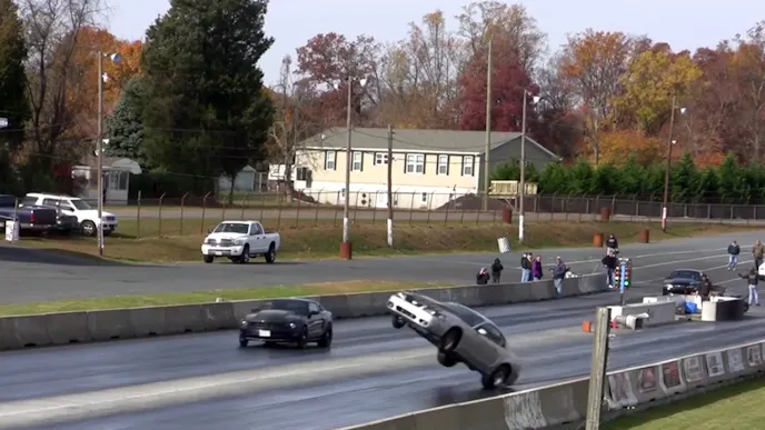Conant’s machine regularly runs mid-1.20s in the 60-foot and hangs the tires a few feet up at the hit. After a normal launch the car kept going up, and up, and almost onto its side, hitting the apex on the right rear wheel only before crashing back to land with a crunch.