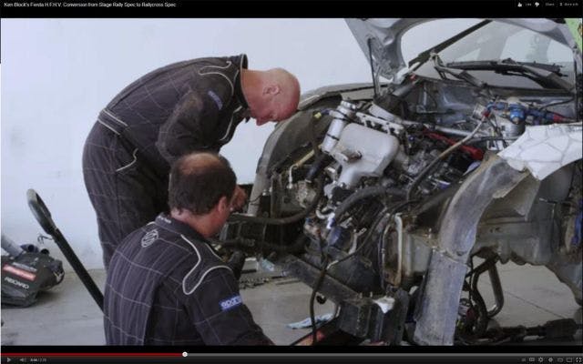 When the sun rises on Wednesday, the re-assembly process begins on the Fiesta. In short order, they put the car back together using completely different components! The Rallycross-spec setup consists of new headlight blanks, Rallycross engine/turbo, 45mm restrictor, larger brakes and Rallycross wheels and tires. They move the radiator into the rear hatch to protect it from the impact of jumps, while improving weight balance. They also opened cooling ducts on side of car and tuned it for 600+ horsepower.
