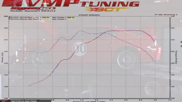 Screaming on the in-house Dyno this is one of the only near stock videos of a dnyo session or dyno results we’ve seen of a ’00 Cobra R in recent memory. The car put down an impressive 390 hp and 388 ft-lbs of torque to the rear tires. While we know the cat-back system is probably good for a few ponies at the wheels, the numbers don’t lie about one thing, the Cobra R was way under rated by Ford from the factory. Assuming a drivetrain loss of 12-percent our calculations put flywheel horsepower for this car at over 435 hp. If that’s correct, and we’re generous on the exhaust gains we’d say it’s safe to assume that stock Cobra Rs probably make closer to 420 hp at the flywheel. That’s a substantial leap from the standard Cobra of the day and even what Ford rated them at when they were knew. It also confirms our own suspicion that these cars were a lot wilder than we were lead to believe.