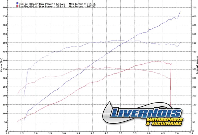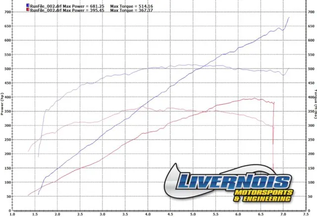 The video shows this car both on the dyno and on the street. On the dyno the package pulled an impressive 681.2 hp and 514.1 lb-ft of torque at peak, that’s a gain of 285.8 hp and 146.8 lb-ft of torque over the baseline run of 395.4 hp and 367.3 lb-ft. On the street, Livernois demonstrates the brutal acceleration, and tire shredding capability of this package.