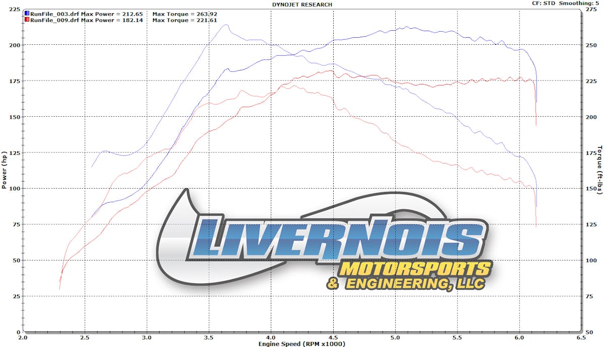 Livernois recently got their hands on a new 2013 Ford Escape, which they promptly used their previous experience with tuning Ford’s EcoBoost engines to see what kind of performance they could pull out of the blue oval’s cross-over SUV. The results are respectable to say the least, the Escape baselined 182 hp, and 221 ft-lbs to the wheels. After a Livernois 93 octane tune was loaded the Escape spun the rollers to 212 hp, and 263 ft-lbs. That’s a gain of 30 hp, and 41 ft-lbs, with only a tune. Studying the dyno graph also reveals that the power comes in earlier and stays strong throughout the engine’s operating range.