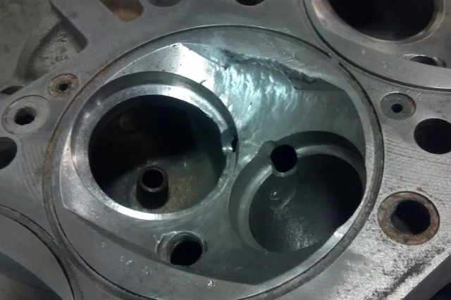 Simone explains that the castings are made from 355 aluminum, with only a T-5 heat-treat spec – which requires a very specific, nearly “cold” welding process to repair properly. Modern aluminum heads are made from a far more dense 356 aluminum with a much tougher T-6 heat-treat spec. Knowing the difference is key. When weld repairs are done properly, he can then install new valve seats if necessary and perform all other critical valve/seat and guide work without fear of the heads springing a leak when they’re complete and on the engine.