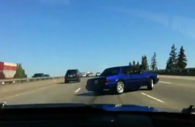 There is no telling what actually happened, given the brevity and shakiness of the clip. What we can tell you is that halfway into the 14-second clip, there is the distinct growl of a Mustang motor, and then the camera shifts just in time to see the back end of a blue stallion getting squirrelly.