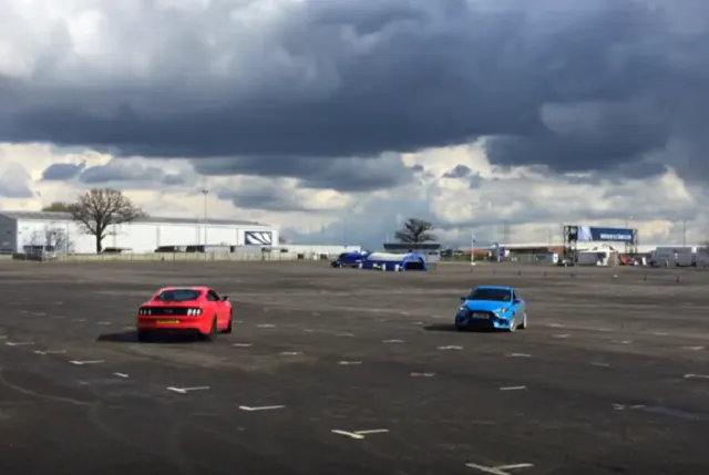 It’s difficult to tell what kind of Mustang it is we’re looking at, as the Focus RS driver is antsy to get on the Silverstone track, giving the gas pedal impatient stabs that result in the trademark muffler gurgle Ford worked into its hot hatch. Judging from how easily the Mustang moves around its line though, we’re going to guess it’s the 430 horsepower V8 at work in this video.