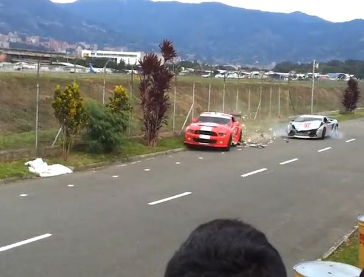 The obviously inexperienced Lambo driver then over corrects while simultaneously slamming on his brakes, a very big no-no if you’re trying to regain control. The Lambo turns to the right and slams into the door of the Shelby…which carries on its merry way, leaving smashed bits of Lamborghini littering the track.