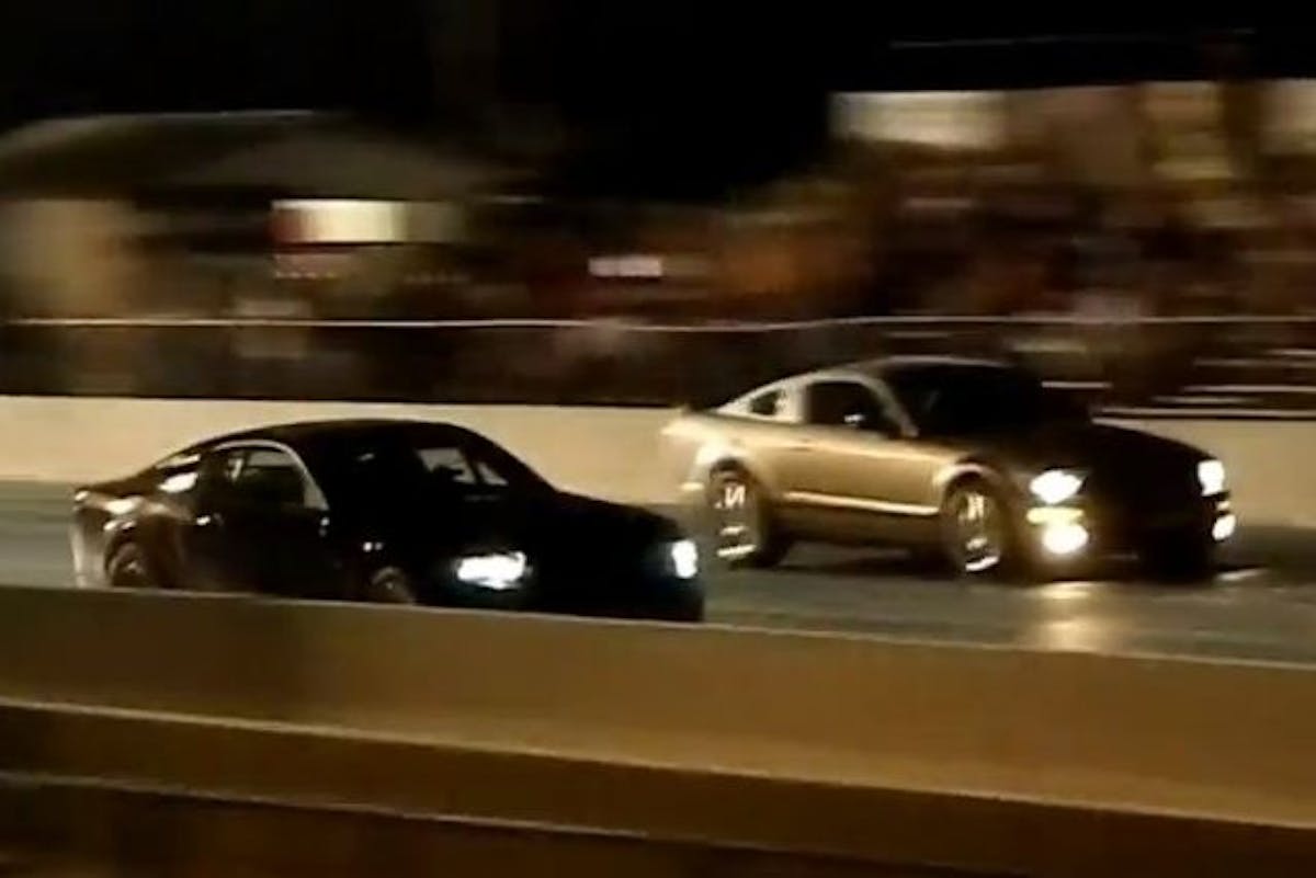 From the looks of it, the GT500 is a pre-2009 model, which means it lacks all the awesome upgrades (including 100 extra horsepower) to the 2013 Shelby GT500. In other words, this race was over before it started, though the 2013 GT500 probably wouldn’t have fared much better.