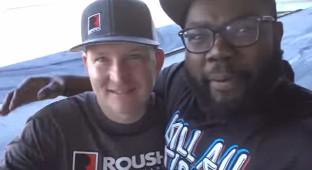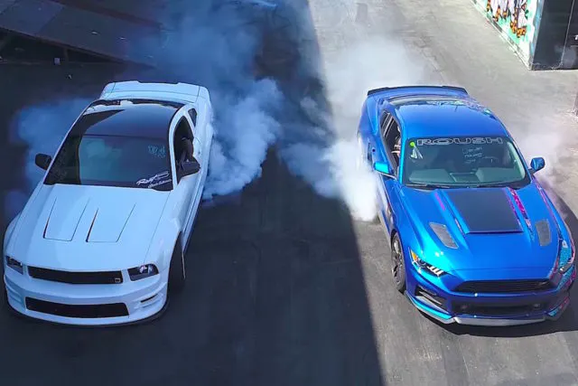 As good a driver as he is, Jason Pawlak is not good enough to drive both cars at once, so Hert Eugene Jr., Senior Content Director for Hoonigan, got the nod to drive Project SidewayS197 against Justin and his factory-fresh Roush hot rod. While Hert has plenty of seat time behind some cool rides ,and can certainly lay down a sweet burnout inside the Doughnut Garage, no one could predict or prepare to attempt the move Justin Pawlak had in store for his burnout!