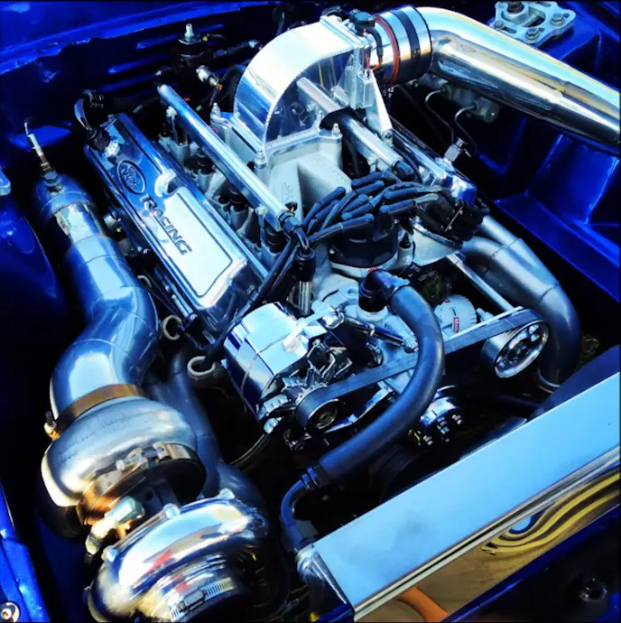 Outfitted with a Ford Racing BOSS block, the 331 cubic-inch engine has forged internals, and features AFR 205 heads, with shaft rockers bumped by a custom solid-roller camshaft. A Precision Turbo 88mm snail breathes 16.5 psi of boost into the engine during this video. The whole combination runs on pump gas with a little help from water-methanol injection to keep the internals happy as boost climbs. Fast XFI 2.0 manages the engine functions. Exhaust is fed from the 4-inch to 3.5-inch downpipe, and then out a single bullet muffler.