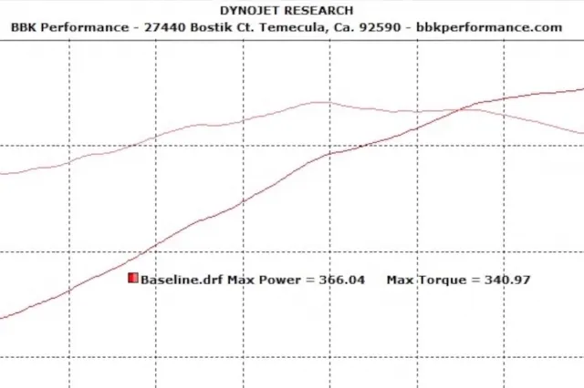 With the car baselined before and after, we can see that the stock Mustang GT made 366 peak hp and 340 ft-lbs peak torque on the dyno. Peak numbers are great, but the power an engine uses the most is what we call the area under the curve. Taking a look at the post-installation dyno numbers we can see that stock at 4,300 RPM the engine was making 276.51 hp and 337 ft-lbs torque. At that same RPM with the BBK cold air intake and throttle body installed the car made 305 hp and 372.69 ft-lbs of torque, a gain of 35 ft-lbs and 29 horsepower. These are strong results, and will ultimately yield usable power that owners will notice in all driving situations. For more information on these and other BBK products for your Mustang, check out the BBK Performance web site.